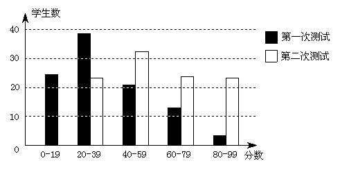 (3)第一次测试中,中位数在 分数段,第二次测试中,中位数在 分数段.