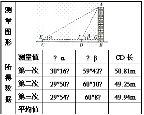 ②若测量仪器高度为1.52m,根据上表数据求教学楼高AB。