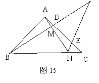 26.如图15,Rt△ABC中AB=AC,点D、E是线段AC上两动点,且AD=EC,AM垂直BD,垂足为M,AM的延长线交BC于点N,直线BD与直线NE相交于点F。