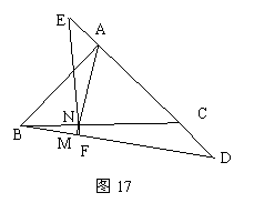附加题:如图17,若点D、E是直线AC上两动点,其他条件不变,试判断△DEF的形状,并说明理由。