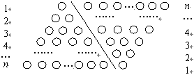 如果采用数形结合的方法,即用图形的性质来说明数量关系的事实,那就非常的直观.现利用图形的性质来求1+2+3+4+…+n 的值,方案如下:如图,斜线左边的三角形图案是由上到下每层依次分别为1,2,3,…,n个小圆圈排列组成的.而组成整个三角形小圆圈的个数恰为所求式子1+2+3+4+…+n的值.为求式子的值,现把左边三角形倒放于斜线右边,与原三角形组成一个平行四边形.此时,组成平行四边形的小圆圈共有n行,每行有(n+1)个小圆圈,所以组成平行四边形小圆圈的总个数为n(n+1)个,因此,组成一个三角形小圆圈的个数为