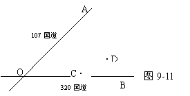 如图9-11,107国道OA和国道OB在我市相交于O点,在∠AOB的内部有工厂C和D,现要修建一个货站P,使P到OA、OB的距离相等且PC=PD,用尺规作货站P的位置(不写作法,保留作图痕迹,写出结论).