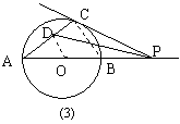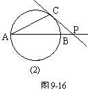 (2) 当点P在AB延长线上,如图9-16(2)和(3)所示时,连结AC,请你分别在这两个圆中用尺规作∠APC的平分线(不写作法,保留痕迹),设此角平分线交AC于点D,然后在这两个图中分别测量出∠CDP的度数.