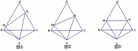 26、操作:如图①,△ABC是正三角形,△BDC是顶角∠BDC=120°的等腰三角形,以D为顶点作一个60°角,角的两边分别交AB、AC边于M、N两点,连接MN.