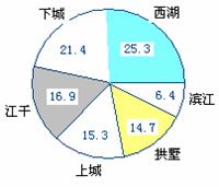 14. 据2005年初数据统计, 杭州市6区共有初中班级数1380个, 各区班级数百分比例的扇形图如右所示. 由此, 可知江干区的初中班级数比全市6区班级数的平均数多 _____ 个. (图中缺了%已添上)