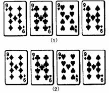 10、(2004年绍兴)4张扑克牌如图(1)所示放在桌子上,小敏把其中一张旋转180º后得到如图(2)所示,那么她所旋转的牌从左数起是( )