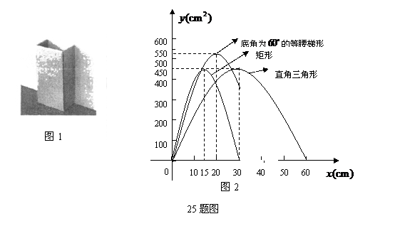 4、(济南)某校数学研究性学习小组准备设计一种高为60cm的简易废纸箱.如图1,废纸箱的一面利用墙,放置在地面上,利用地面作底,其它的面用一张边长为60cm的正方形硬纸板围成.经研究发现:由于废纸箱的高是确定的,所以废纸箱的横截面图形面积越大,则它的容积越大.