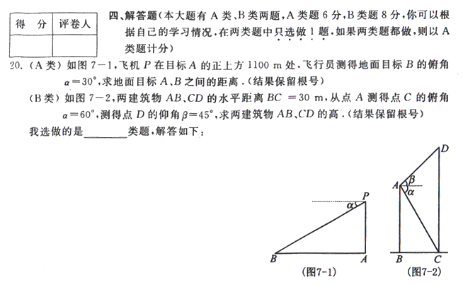 6、在数学活动课上,老师带领学生去测量河两岸A、B两处之间的距离,先从A处出发与AB垂直方向,向前走了10米到处C,在C处测得∠ACB=600,(如图4所示),那么A,B之间的距离约为