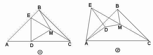 (1)若点D在边AC上,点E在边AB上且与点B不重合,如图①,求证:BM=DM且BM⊥DM;
