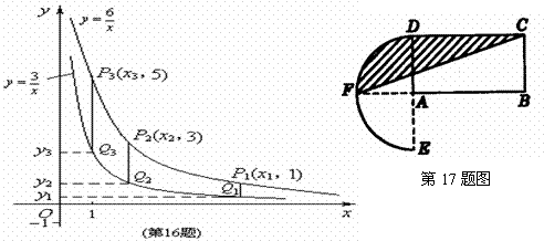 17、设计一个商标图案:先作矩形ABCD,使AB=2BC,AB=8,再以点A为圆心、AD的长为半径作半圆,交BA的延长线于F,连FC. 图中阴影部分就是商标图案,该商标图案的面积等于 (不取近似值)。