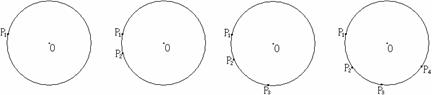 如图,在下列四个圆上分别有1个点、2个点、3个点、4个点.试观察这几个图形,解答下列三个问题:
