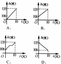 三峡工程在6月1日至6月10日下闸蓄水期间,水库水位由106米升至135米,高峡平湖初现人间.假设水库水位匀速上升,那么下列图象中,能正确反映这10天水位h(米)随时间t(天)变化的是( ).