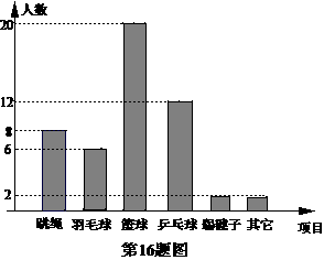 16、“阳光体育”运动在我市轰轰烈烈开展,为了解同学们最爱好的阳光体育运动项目,小王对本班50名同学进行了跳绳、羽毛球、篮球、乒乓球、踢毽子等运动项目最喜爱人数的调查,并根据调查结果绘制了如上的人数分布直方图,若将其转化为扇形统计图,那么最喜爱打篮球的人数所在扇形区域的圆心角的度数为( ).