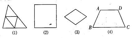 32、 已知,连结三角形三边中点,把任意三角形分成四个小三角形,它们的形状,大小完全相同,并且与原三角形相似,如图(1)请把图(2)、(3)、(4)同样分成四块,使它们形状大小相同,且都和原图形相似,(注:图(2)为正方形,图(3)为菱形,图(4)为等腰三角形,且AD//BC,AB=CD=AD,∠B=60°)