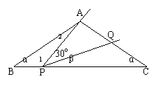35、如图△ABC中,∠B=∠C=α(0<α<600).将一把三角尺中300角顶点P放在BC边上,当P在BC边上移动时,三角尺中300角的一条边始终过点A,另一条边交AC边于点Q,P、Q不与三角形顶点重合.设∠CPQ=β.
