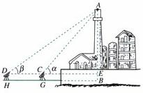(本题8分)如图,这是测量一座底部不可到达的高楼AB(A为最高点,B为底部)的测量方案示意图。DH、CG为量角仪,高度为1.35米,测得仰角