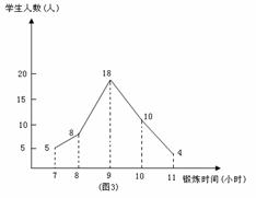6. 教育部门发出在中小学开展“阳光体育活动”之后.某学校调查了初三某班45名同学一周参加体育锻炼的情况,并把它绘制成折线统计图(如图3),那么关于该班45名同学一周参加体育锻炼的时间说法错误的是( )
