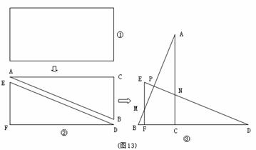 (6分) 如图13,将一张矩形纸片沿对角线剪开,得到两张三角形纸片,再将这两张纸片摆放成如下图③的形式,使点