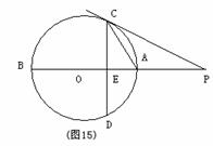 (10分)如图15,AB是⊙O的直径,点P在BA的延长线上,弦CD⊥AB,垂足为E,且![]()