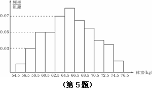 5.为了了解某地区高三学生的身体发育情况,抽查了该地区100名年龄为17.5岁-18岁的男生体重(kg) ,得到频率分布直方图(见右图) 根据右图可得这100名学生中体重在(56.5,64.5)的学生人数是 ▲ .