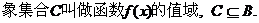 定义:设A,B都是解空的数的集合,f是从A到B的一个对应法则,那么A到B的映射f:A→B叫做A到B的函数.记作y=f(x),其中x∈A,y∈B.原象的集合A叫做函数f(x)的定义域。