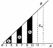 OA的垂线与OB相交,得到并标出一组黑色梯形,它们的面积分别为