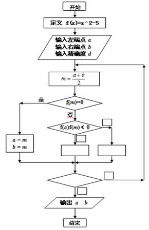 程序如下: Define f(x)=x^2-5 Input “a=”;a Input “b=”;b Input “d<”;d Do If f(m)=0 then a = m b = m Else If f(a)f(m)<0 then ___________ Else ____________ End if End if Loop until ____________ Print a , b End |