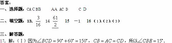 (10分)如图,△ACD是等边三角形,△ABC是等腰直角三角形,∠ACB=90°,BD交AC于E,AB=2。(1)求cos∠CBE的值;(2)求AE。