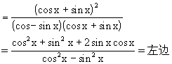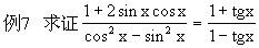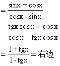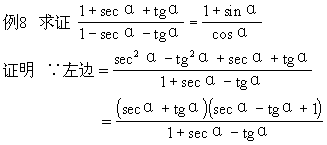 说明 以上证明中采用了“1的代换”的技巧,即将1用sec2α-tg2α代换,可是解题者怎么会想到这种代换的呢?很可能,解题者在采用这种代换时,已经预见到代换后,分子可以因式分解,可以约分,而所有这一切都是建立在熟悉公式的各种变形的基础上的,当然,对不熟练的解题者而言,还有如下的“一般证法”--即证明“左边-右边=0”