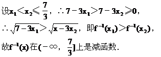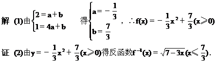 [例5]设点M(1,2)既在函数f(x)=ax2+b(x≥0)的图像上,又在它的反函数图像上,(1)求f-1(x),(2)证明f-1(x)在其定义域内是减函数.