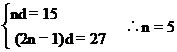 [例14] 在项数为2n的等差数列中,各奇数项之和为75,各偶数项之和为90,末项与首项之差为27,则n之值是多少?