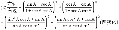 (2)(sinA+ secA)3+(cosA+cscA)2=(1+secAcscA)2