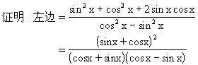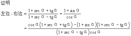 说明 以上证明中采用了“1的代换”的技巧,即将1用sec2α-tg2α代换,可是解题者怎么会想到这种代换的呢?很可能,解题者在采用这种代换时,已经预见到代换后,分子可以因式分解,可以约分,而所有这一切都是建立在熟悉公式的各种变形的基础上的,当然,对不熟练的解题者而言,还有如下的“一般证法”--即证明“左边-右边=0”