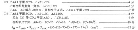 如图,在三棱锥A-BCD中,AB⊥平面BCD,它的正视图和俯视图都是直角三角形,图中尺寸单位为cm。(I)在正视图右边的网格内,按网格尺寸和画三视图的要求,画出三棱锥的侧(左)视图;(II)证明:CD⊥平面ABD;(III)按照图中给出的尺寸,求三棱锥A-BCD的侧面积。