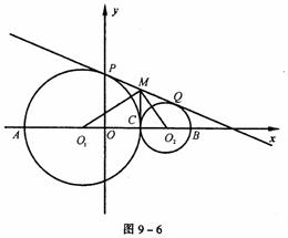 20.如图9-6,已知点A、B的坐标分别是(-3,0),(3,0),点C为线段AB上任一点,P、Q分别以AC和BC为直径的两圆O1,O2的外公切线的切点,求线段PQ的中点的轨迹方程。