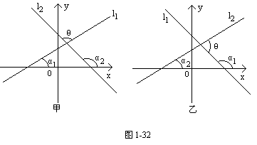设l1、l2的倾斜角分别是α1和α2(图1-32),甲图的特征是l1到l2的角是l1、l2和x轴围成的三角形的内角;乙图的特征是l1到l2的角是l1、l2与x轴围成的三角形的外角.