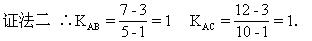 例3 证明:三点A(1,3)、B(5,7)、C(10,12)在同一条直线上.