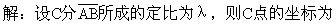 此题按常规解题思路可先用两点式求出AB的方程,然后解方程组得到点C的坐标,再求点C分AB所成的定比,计算量大了一些.如果先用定比分点公式设出点C的坐标(即满足点C在直线AB上),然后代入已知的直线方程求λ,则计算量要小得多.
