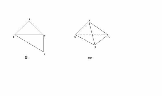 如图,把一副三角形板拼接(如图1),BC=6cm,∠BAC=90°,AB=AC,∠BCD=90°,∠BDC=60°,再把两块三角板沿BC折成直二面角(如图2)。
