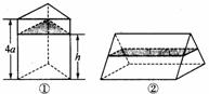 9.如图①所示的是一个正三棱柱形容器,高为4a,内装水若干,将容器放倒一个侧面而成为底面,这时水面恰为中截面,其图如图②所示,则未放倒前的水面高度h=___________(用a表示).