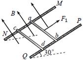 如图所示,两根足够长的光滑金属导轨MN、PQ间距为l=0.5m,其电阻不计,两导轨及其构成的平面均与水平面成30°角。完全相同的两金属棒ab、cd分别垂直导轨放置,每棒两端都与导轨始终有良好接触,已知两棒的质量均为m= 0.02kg,电阻均为R=0.1Ω,整个装置处在垂直于导轨平面向上的匀强磁场中,磁感应强度为B=0.4T,棒ab在平行于导轨向上的力F1作用下,以速度v=2m/s沿导轨向上匀速运动,而棒cd在平行于导轨的力F2的作用下保持静止。取g=10m/s2,