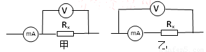 如图所示,用伏安法测量RX电阻,已知电压表的内阻约为几千欧,电流表内阻约为1Ω,若采用甲图的电路,RX的测量值比真实值 (选“偏大”或“偏小”)。若Rx约为10Ω,应采用 (选“甲图”或“乙图”)电路,误差会比较小。![]()