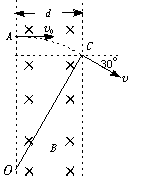 如图所示,一束电子(电量为e)以速度v垂直射入磁感应强度为B、宽度为d的匀强磁场,穿透磁场时的速度与电子原来的入射方向的夹角为θ=300。(不计电子重力)求: