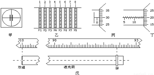 用某种单色光做双缝干涉实验时,已知双缝间距离d=0.25mm,双缝到毛玻璃屏间距离L的大小由下图中毫米刻度尺读出(如戊图所示),实验时先移动测量头(如图甲所示)上的手轮,把分划线对准靠近最左边的一条明条纹(如图乙所示),并记下螺旋测微器的读数x