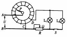 如图是一种理想自耦变压器示意图,线圈绕在一个圆环形的铁芯上,P是可移动的滑动触头。输入端AB接交流电压U,输出端CD连接了两个相同的灯泡L1和L2,Q为滑动变阻器的滑动触头。当开关S闭合,P处于如图所示的位置时,两灯均能发光。下列说法正确的是