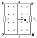 如图所示,光滑金属导轨 PN与QM相距1 m,电阻不计,两端分别接有电阻R1和R2,且R1=6 Ω,R2=3Ω,ab导体棒的电阻为2 Ω.垂直穿过导轨平面的匀强磁场的磁感应强度为1T.现使ab以恒定速度v=3m/s匀速向右移动,求:![]()