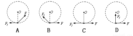 在水平面上,小猴拉着小滑块做匀速圆周运动,O点为圆心,能正确地表示小滑块受到的牵引力F及摩擦力Ff的图是( )
