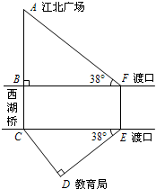 22、如图,家住江北广场的小李经西湖桥到教育局上班,路线为A→B→C→D.因西湖桥维修封桥,他只能改道经临津门渡口乘船上班,路线为A→F→E→D.已知BC∥EF,BF∥CE,AB⊥BF,CD⊥DE,∠AFB=38°,∠CED=38°,AF=200m.请计算小李上班的路程因改道增加了多少米.(结果精确到1m)