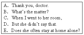 :Last Monday she came out of her room and said there was a mouse in her room. ____2____ I saw nothing. And a moment later she came out again and said the same thing. Yesterday she did it again. You know it is impossible for us to have a mouse in the house.Doctor