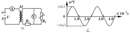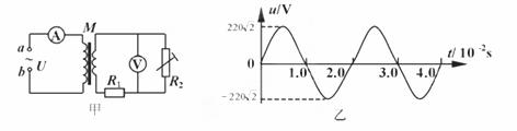 火警报警系统原理如图甲所示,M是一个小型理想变压器,原副线圈匝数之比n1:n2 =10:1,接线柱a、b接上一个正弦交变电源,电压随时间变化规律如图乙所示,在变压器右侧部分,R2为用半导体热敏材料(电阻随温度升高而减小)制成的传感器,R1为一定值电阻。下列说法中正确的是